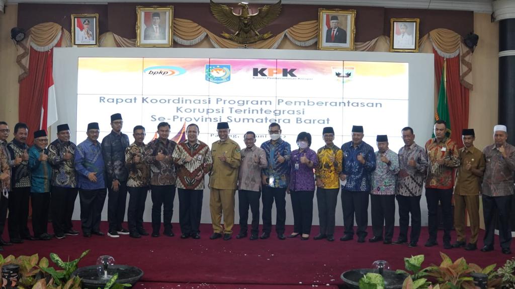 Padang,– Untuk mewujudkan tata kelola pemerintahan dan pelayanan publik yang bersih, akuntabel dan berkualitas, Pemerintah Provinsi serta Kabupaten/ Kota se-Sumatera Barat berkomitmen penuh mencegah terjadinya praktik korupsi. Hal ini tentunya dengan terus meningkatkan transparansi, penyederhanaan proses kerja dan pelayanan kepada masyarakat agar peluang korupsi dapat diminimalisir. Demikian penyampaian Gubernur Sumatera Barat, Mahyeldi pada Rapat Koordinasi Program Pemberantasan Korupsi Terintegrasi Tahun 2022, di Auditorium Gubernuran, Pada selasa (21/6/2022). Rakor yang diselenggarakan oleh KPK tersebut turut dihadiri oleh Ketua KPK Komisaris Jenderal Polisi (Purn.) Drs. Firli Bahuri, Deputi Kepala BPKP Bidang Investigasi Agustina Arumsari, Bupati Limapuluh Kota Safaruddin Dt.Bandaro Rajo serta seluruh kepala daerah di Sumatera Barat.