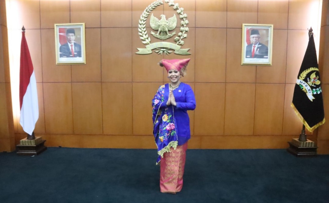 Perempuan berdarah minang itu memakai baju khas minangkabau saat dilantik langsung oleh Ketua Majelis Perwakilan Rakyat (MPR) Bambang Soesatyo (Bamsoet) dalam acara yang digelar dengan protokol Covid-19 ketat itu.