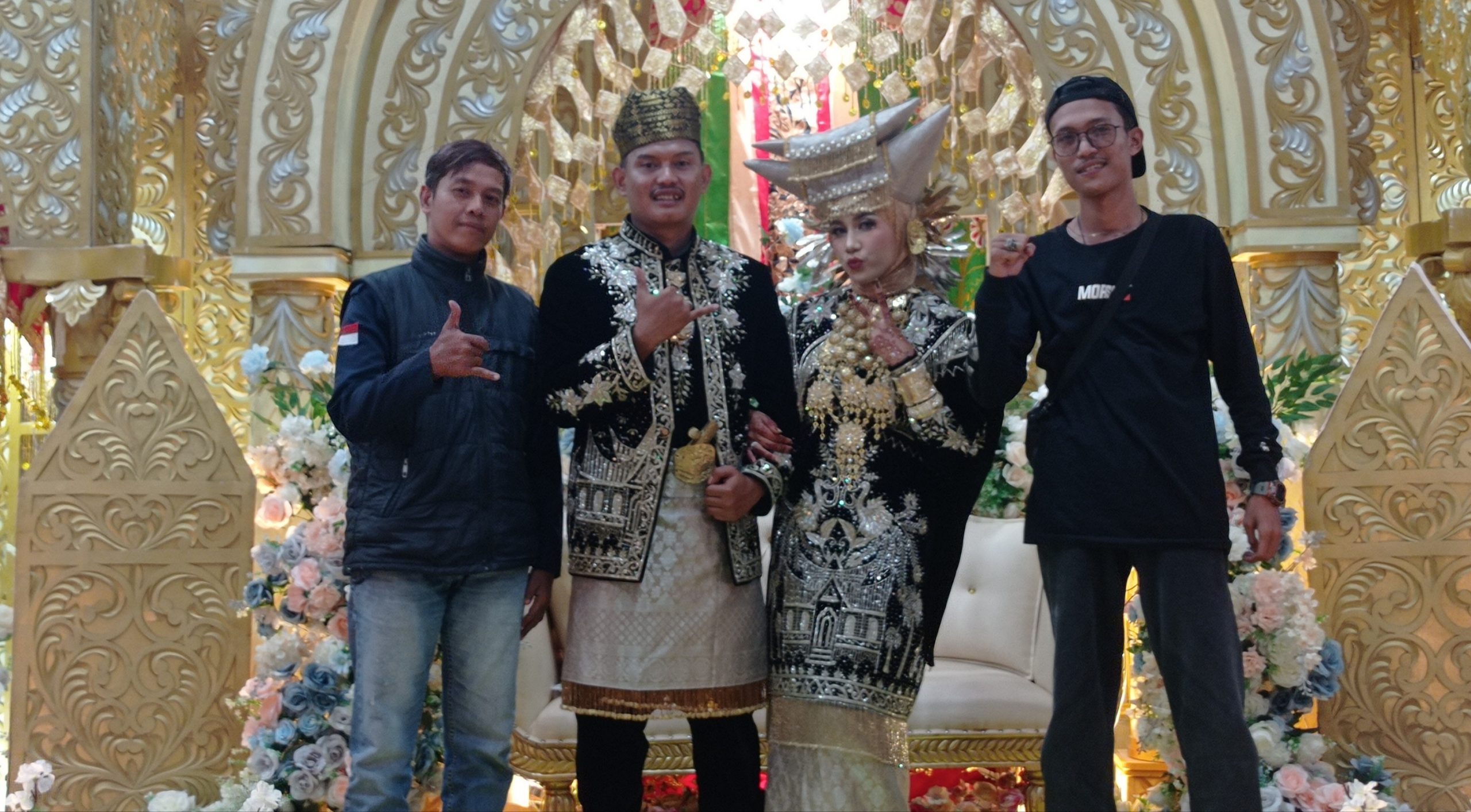 Kedua pengantin tampil anggun dalam balutan busana adat Minangkabau yang elegan, menggambarkan kekayaan budaya daerah yang berpadu dengan suasana religius acara. Kehangatan keluarga dan keramahtamahan masyarakat sekitar menambah kesakralan momen bahagia ini.
